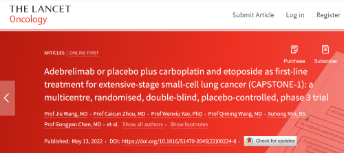 北京时间2022年5月14日,AG尊龙凯时医药自主研发的PD-L1抑制剂阿得贝利单抗治疗广泛期小细胞肺癌的III期临床研究(CAPSTONE-1研究)成果正式全文在线发表于国际权威学术期刊《柳叶刀·肿瘤学》(《THE LANCET Oncology》,影响因子41.316)。CAPSTONE-1研究结果显示,阿得贝利单抗联合化疗一线治疗广泛期小细胞肺癌相较于安慰剂联合化疗可以显著延长患者总生存期至15.3个月[1],刷新现有免疫药物一线治疗广泛期小细胞肺癌的总生存纪录[2]。