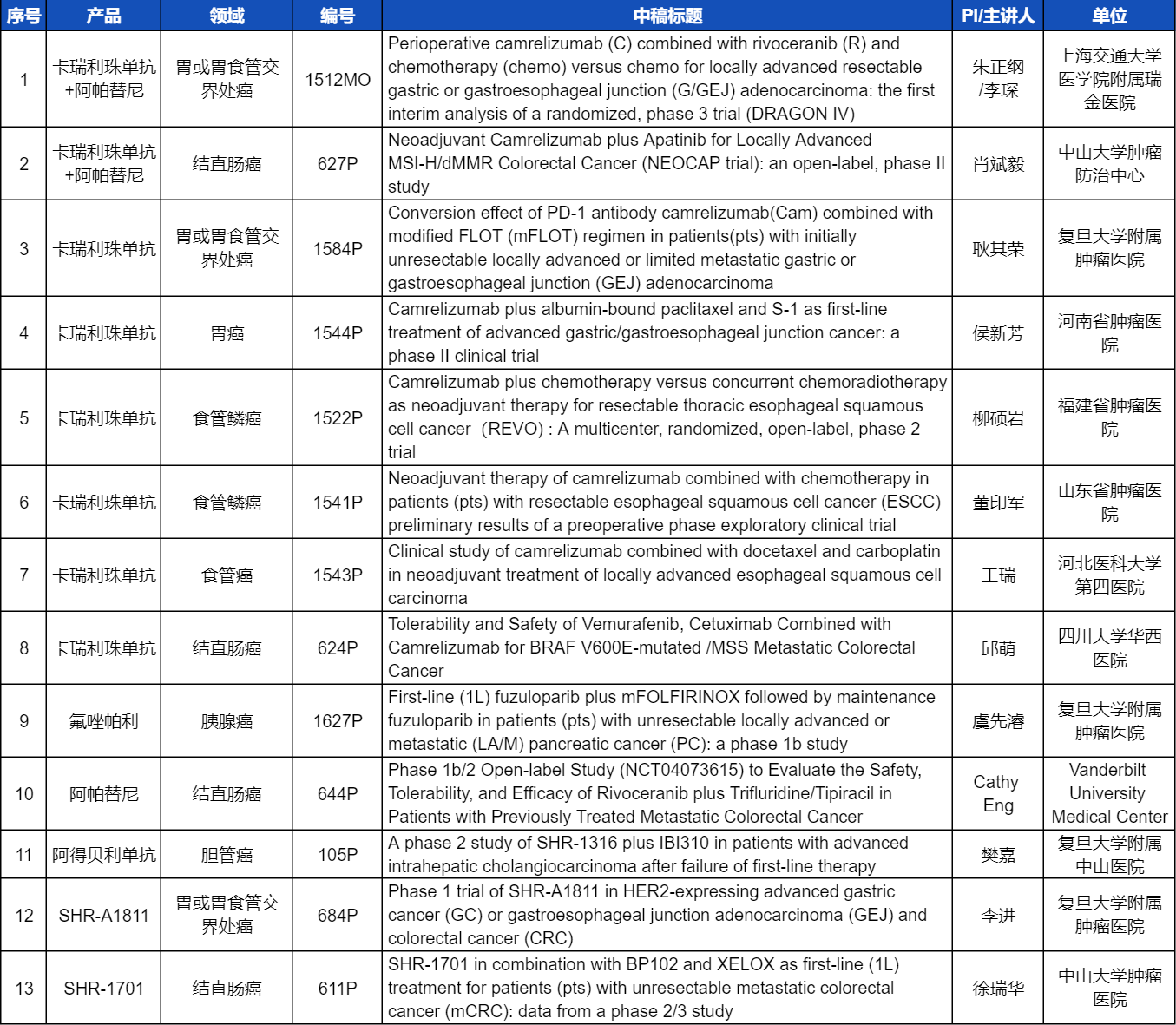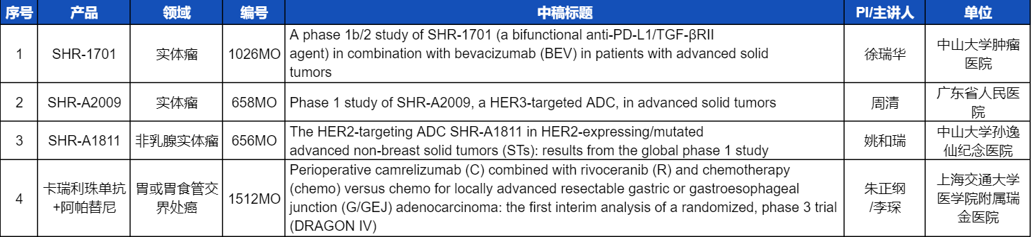 本次ESMO大会,将由中山大学肿瘤医院徐瑞华教授、广东省人民医院周清教授、中山大学孙逸仙纪念医院姚和瑞教授、上海交通大学医学院附属瑞金医院李琛教授分别就4项AG尊龙凯时医药创新产品相关研究做口头报告,包括SHR-1701、SHR-A2009、SHR-A1811这3款未上市创新产品的实体瘤治疗临床研究,以及1项“双艾”组合(卡瑞利珠单抗联合阿帕替尼)治疗局部晚期可切除胃/胃食管交界处癌的Ⅲ期临床试验期中分析。