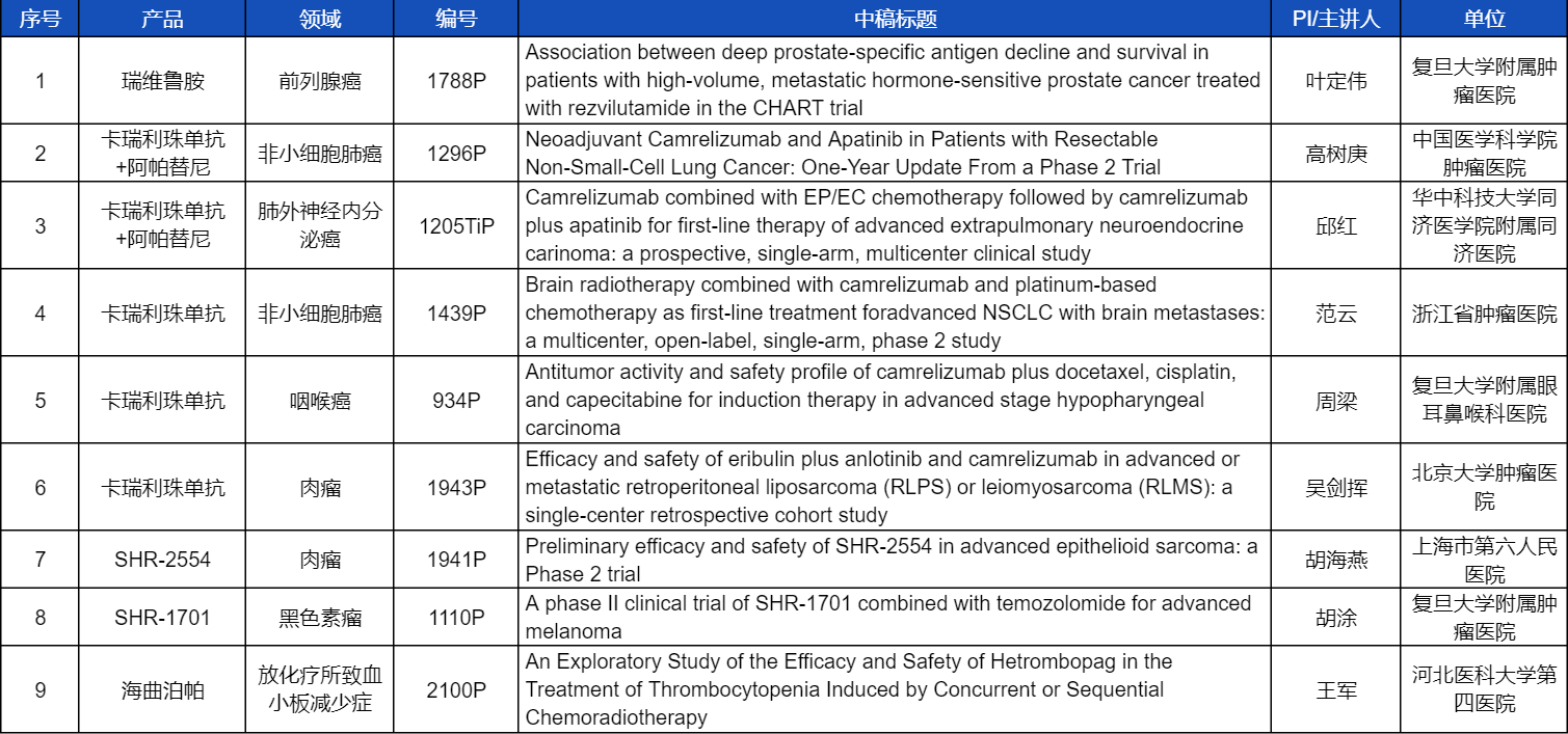 在非小细胞肺癌、咽喉癌、肉瘤、前列腺癌、黑色素瘤等多个领域,卡瑞利珠单抗、阿帕替尼、瑞维鲁胺、SHR-1701、SHR2554等创新产品相关研究一共入选了8项壁报展示。此外,AG尊龙凯时医药自主研发的血小板生成素受体激动剂(TPO-RA)海曲泊帕在放化疗所致血小板减少领域的探索性研究显示良好的疗效,入选壁报展示。