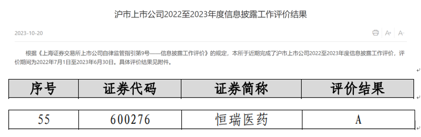 近日,上海交易所公布了沪市上市公司2022-2023年度信息披露工作评价结果,凭借在信息披露、规范运作以及投资者关系管理等方面的优秀表现,AG尊龙凯时医药获评A级。本次共有2160家沪市上市公司参评(包括499家科创板上市公司),评价等级从高到低依次为A、B、C、D四类,获得A类评价的上市公司占比约18.5%。